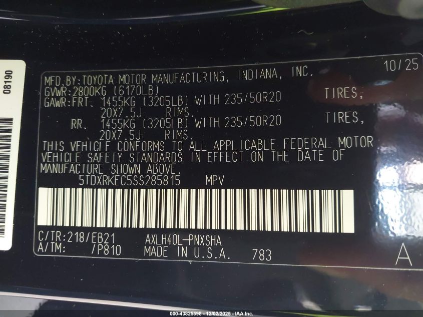 2025 TOYOTA SIENNA 2025 року Гібрид, 2.5, Передній привід, vin - 5TDXRKEC5SS285815 з США