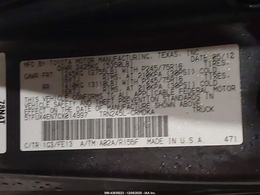 2012 TOYOTA TACOMA 2012 року Бензин, 2.7, Повний привід, vin - 5TFUX4EN7CX014997 з США