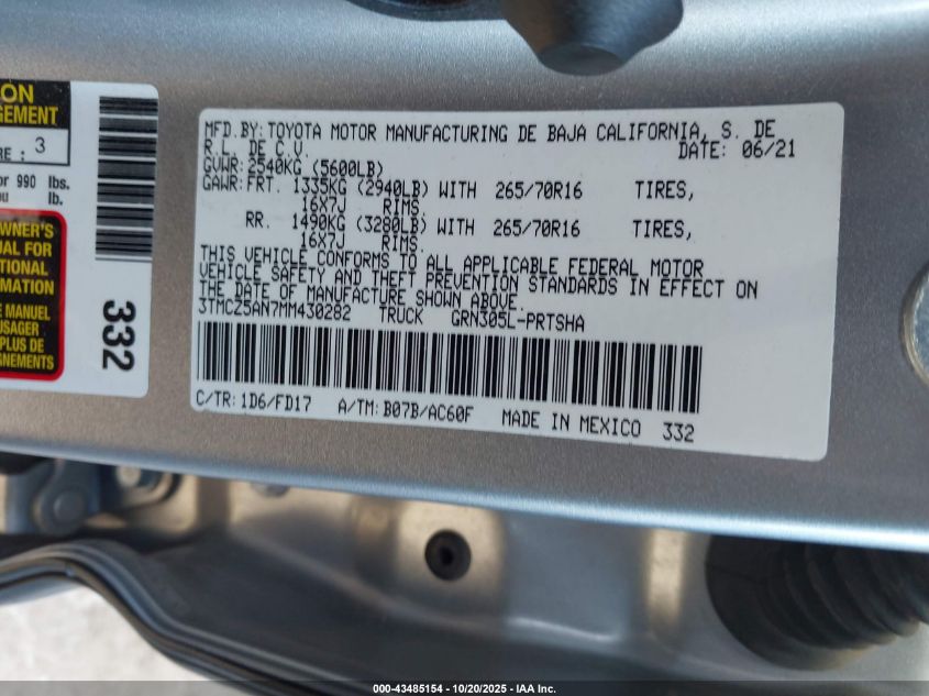 2021 TOYOTA TACOMA 2021 року Бензин, 3.5, Повний привід, vin - 3TMCZ5AN7MM430282 з США