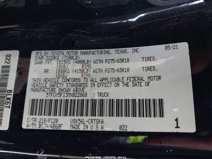 2021 TOYOTA TUNDRA 2021 року Бензин, 5.7, Повний привід, vin - 5TFUY5F13MX022868 з США