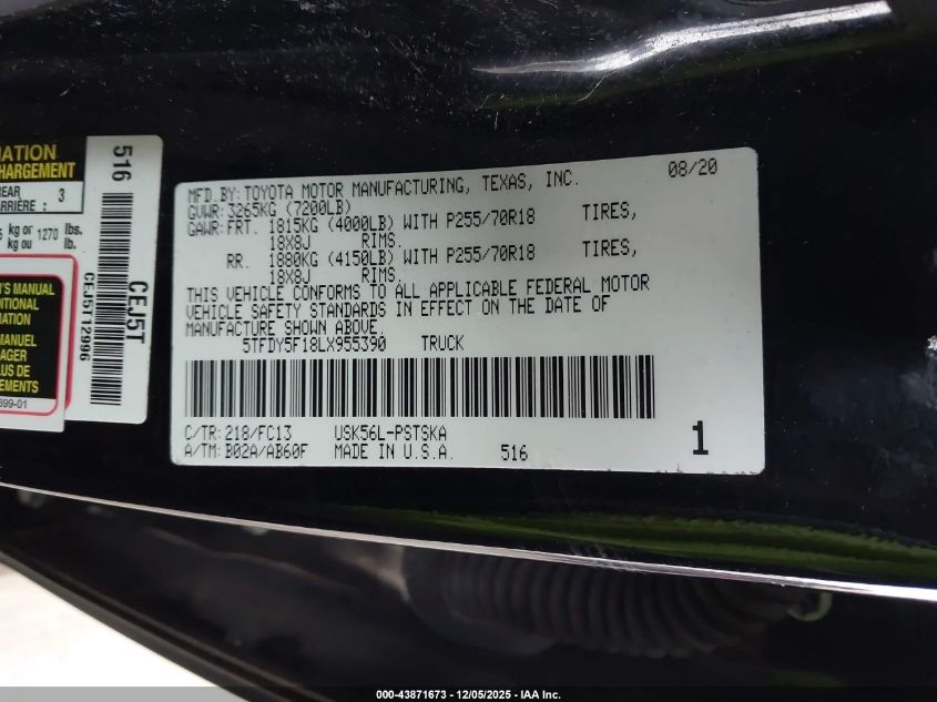 2020 TOYOTA TUNDRA 2020 року Бензин, 5.7, Повний привід, vin - 5TFDY5F18LX955390 з США