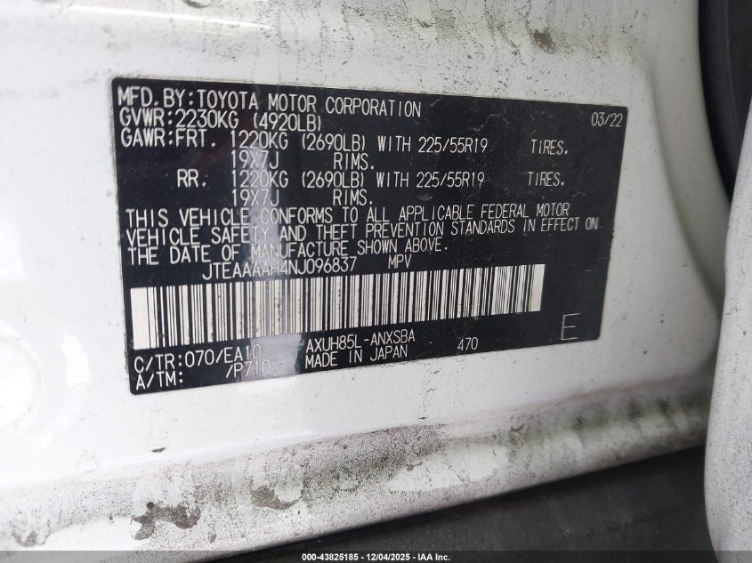 2022 TOYOTA VENZA 2022 року Гібрид, 2.5, Повний привід, vin - JTEAAAAH4NJ096837 з США