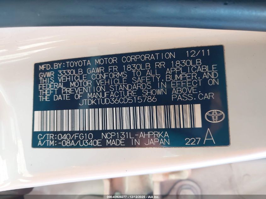 Колір БілийЦиліндри 4Привід Передній привідVIN JTDKTUD36CD515786Стан Заводиться та їде (перевірено)Ушкодження Передня або задня AutoRIA