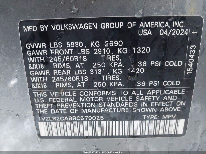 2024 VOLKSWAGEN ATLAS 2024 року Бензин, 2.0, Повний привід, vin - 1V2LR2CA8RC579025 з США