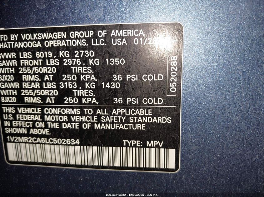 2020 VOLKSWAGEN ATLAS 2020 року Бензин, 3.6, Повний привід, vin - 1V2MR2CA6LC502634 з США