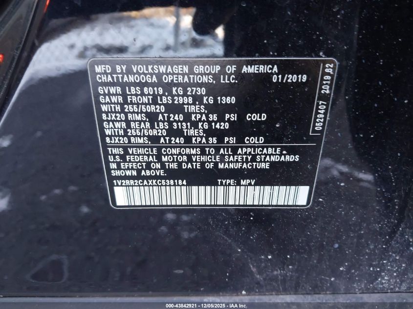 2019 VOLKSWAGEN ATLAS 2019 року Бензин, 3.6, Повний привід, vin - 1V2RR2CAXKC538184 з США