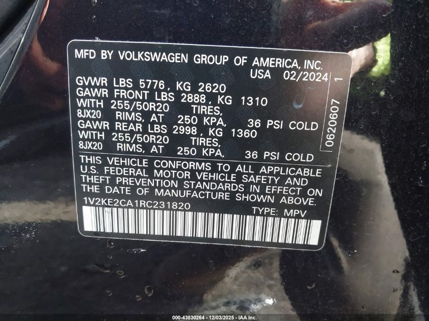 2024 VOLKSWAGEN ATLAS CROSS SPORT 2024 року Бензин, 2.0, Повний привід, vin - 1V2KE2CA1RC231820 з США