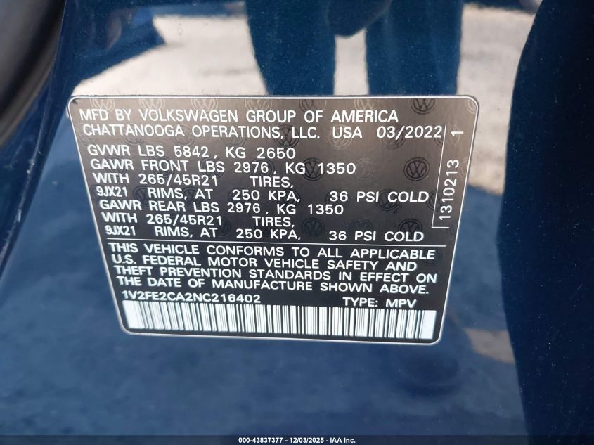 2022 VOLKSWAGEN ATLAS CROSS SPORT 2022 року Бензин, 3.6, Повний привід, vin - 1V2FE2CA2NC216402 з США