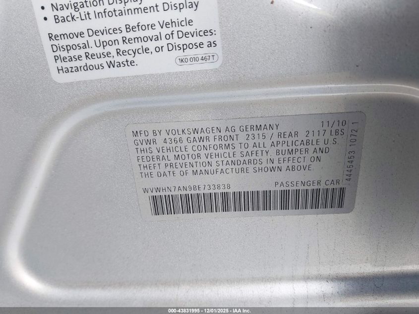 2011 VOLKSWAGEN CC 2011 року Бензин, 2.0, Передній привід, vin - WVWHN7AN9BE733838 з США