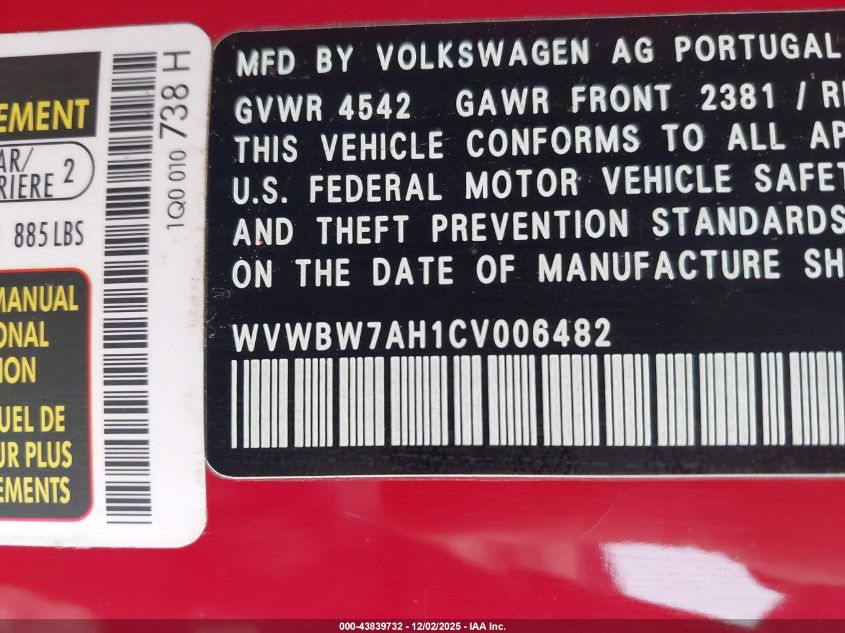 2012 VOLKSWAGEN EOS 2012 року Бензин, 2.0, Передній привід, vin - WVWBW7AH1CV006482 з США