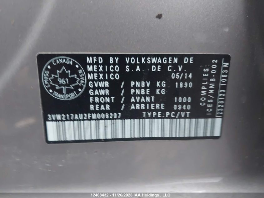 2015 VOLKSWAGEN GOLF 2015 року Бензин, , Передній привід, vin - 3VW217AU2FM006207 з США