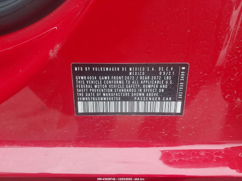2021 VOLKSWAGEN JETTA 2021 року Бензин, 1.4, Передній привід, vin - 3VWN57BUXMM086756 з США
