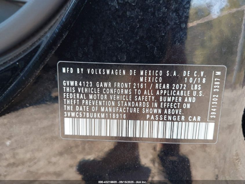 2019 VOLKSWAGEN JETTA 2019 року Бензин, 1.4, Передній привід, vin - 3VWC57BU8KM118916 з США