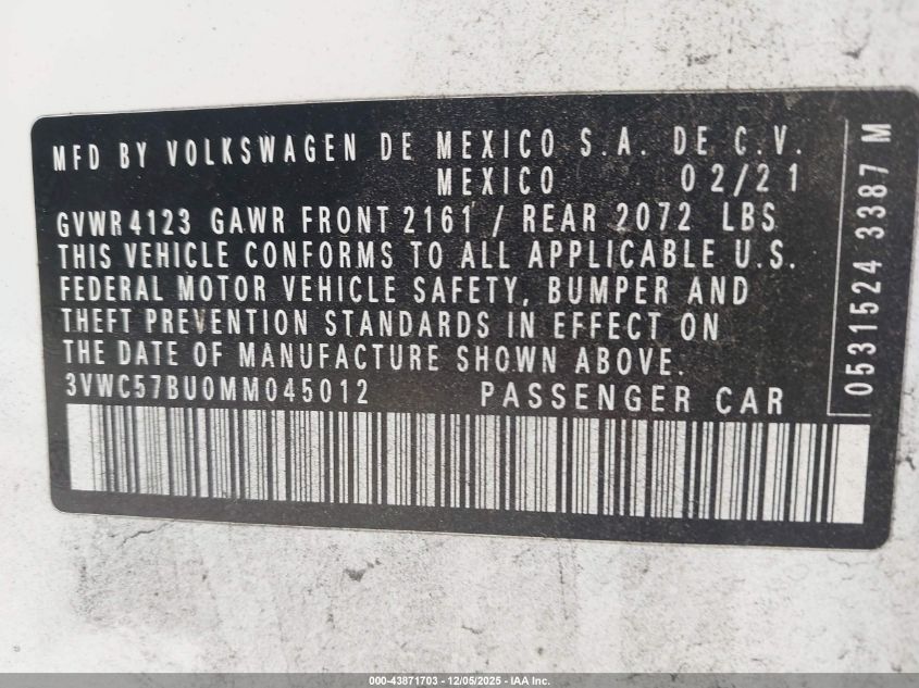 2021 VOLKSWAGEN JETTA 2021 року Бензин, 1.4, Передній привід, vin - 3VWC57BU0MM045012 з США