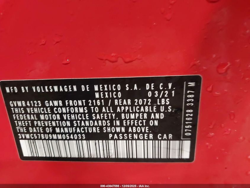 2021 VOLKSWAGEN JETTA 2021 року Бензин, 1.4, Передній привід, vin - 3VWC57BU9MM054033 з США