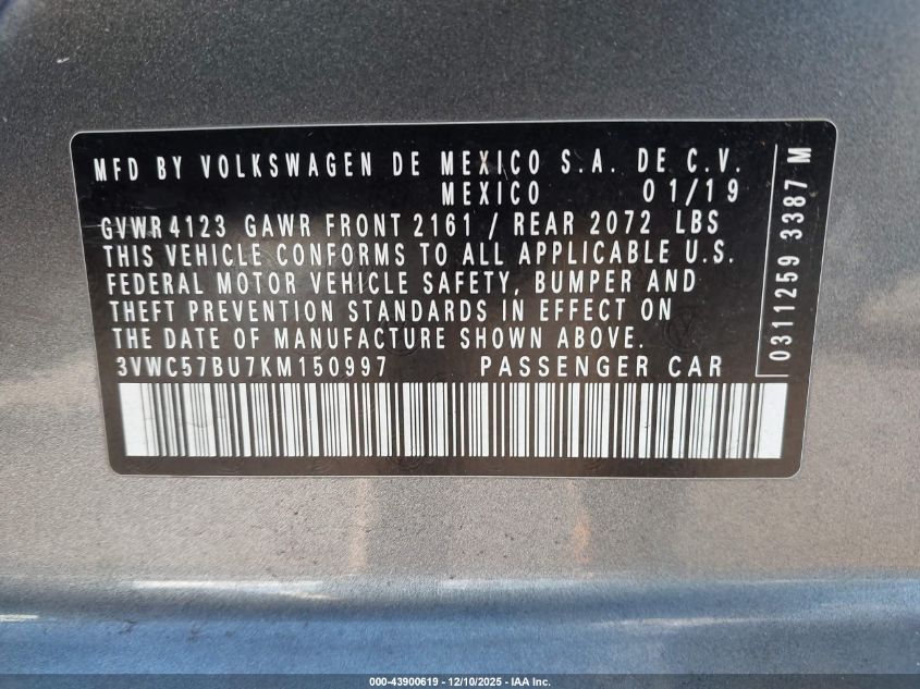 2019 VOLKSWAGEN JETTA 2019 року Бензин, 1.4, Передній привід, vin - 3VWC57BU7KM150997 з США
