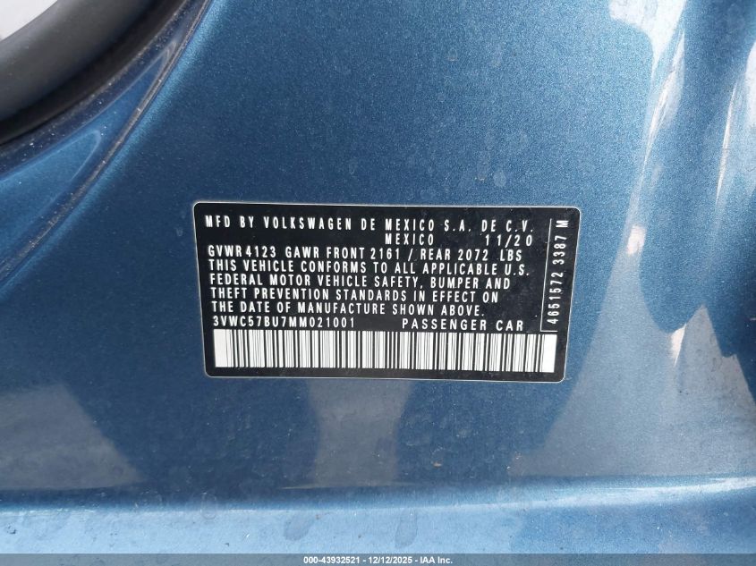 2021 VOLKSWAGEN JETTA 2021 року Бензин, 1.4, Передній привід, vin - 3VWC57BU7MM021001 з США