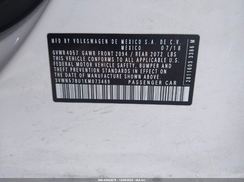 2019 VOLKSWAGEN JETTA 2019 року Бензин, 1.4, Передній привід, vin - 3VWN57BU1KM073469 з США