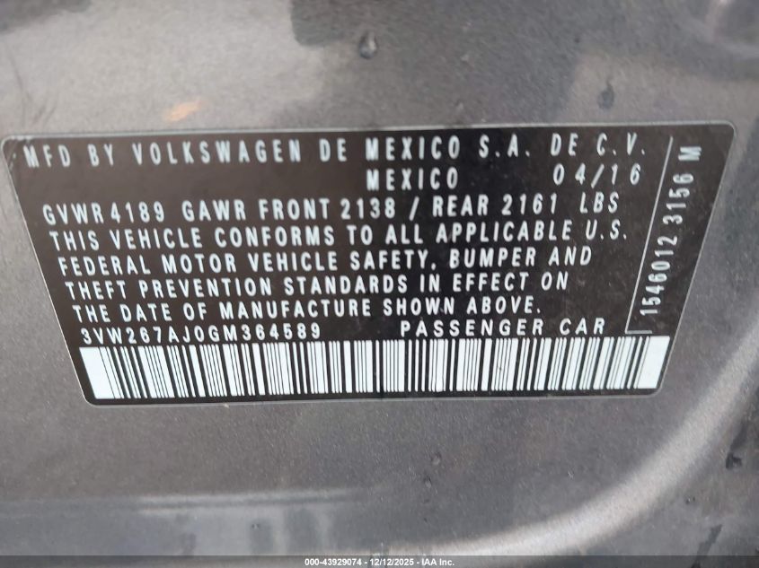 2016 VOLKSWAGEN JETTA 2016 року Бензин, 1.4, Передній привід, vin - 3VW267AJ0GM364589 з США
