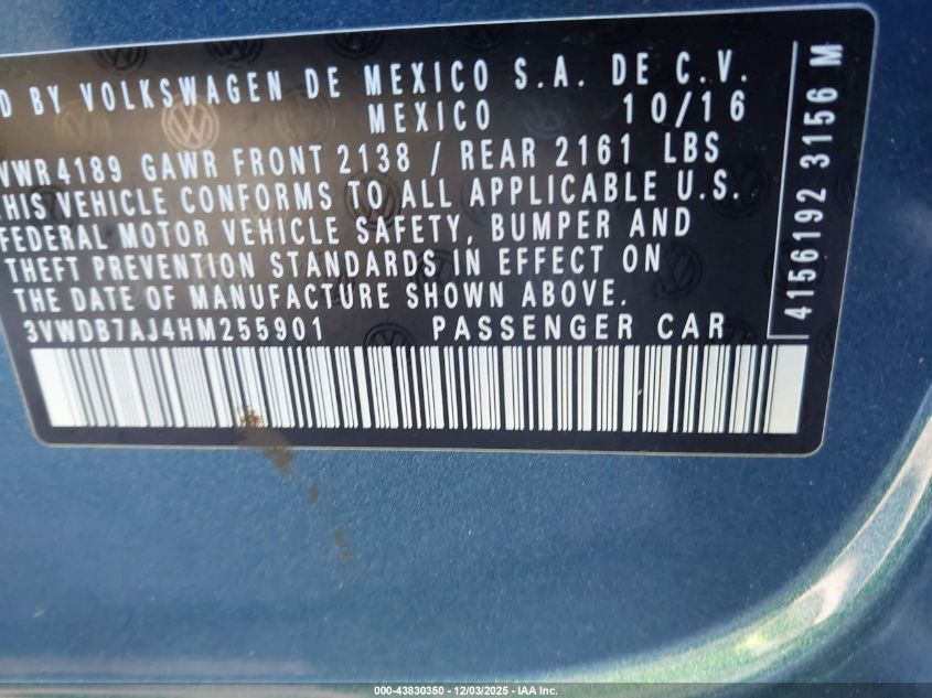 2017 VOLKSWAGEN JETTA 2017 року Бензин, 1.4, Передній привід, vin - 3VWDB7AJ4HM255901 з США