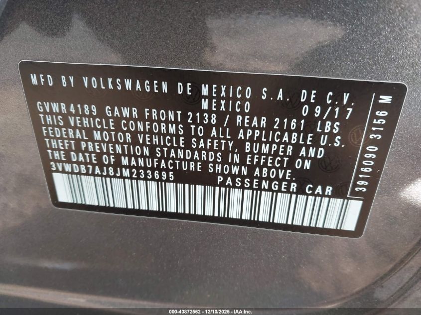 2018 VOLKSWAGEN JETTA 2018 року Бензин, 1.4, Передній привід, vin - 3VWDB7AJ8JM233695 з США
