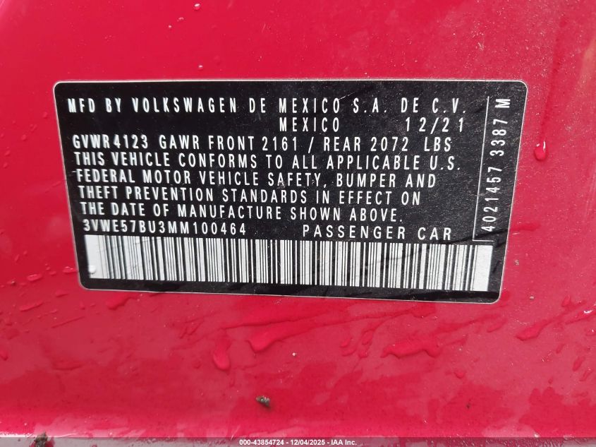 2021 VOLKSWAGEN JETTA 2021 року Бензин, 1.4, Передній привід, vin - 3VWE57BU3MM100464 з США