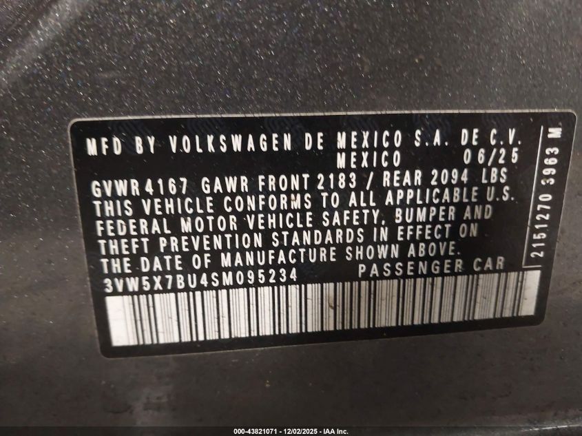 2025 VOLKSWAGEN JETTA 2025 року Бензин, 1.5, Передній привід, vin - 3VW5X7BU4SM095234 з США