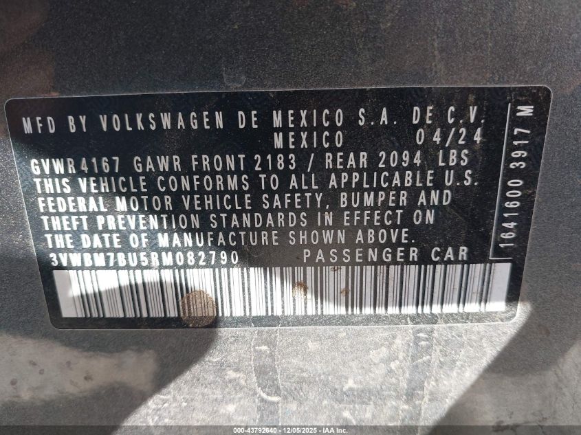 2024 VOLKSWAGEN JETTA 2024 року Бензин, 1.5, Передній привід, vin - 3VWBM7BU5RM082790 з США