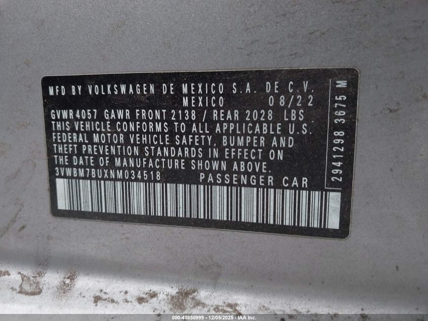 2022 VOLKSWAGEN JETTA 2022 року Бензин, 1.5, Передній привід, vin - 3VWBM7BUXNM034518 з США
