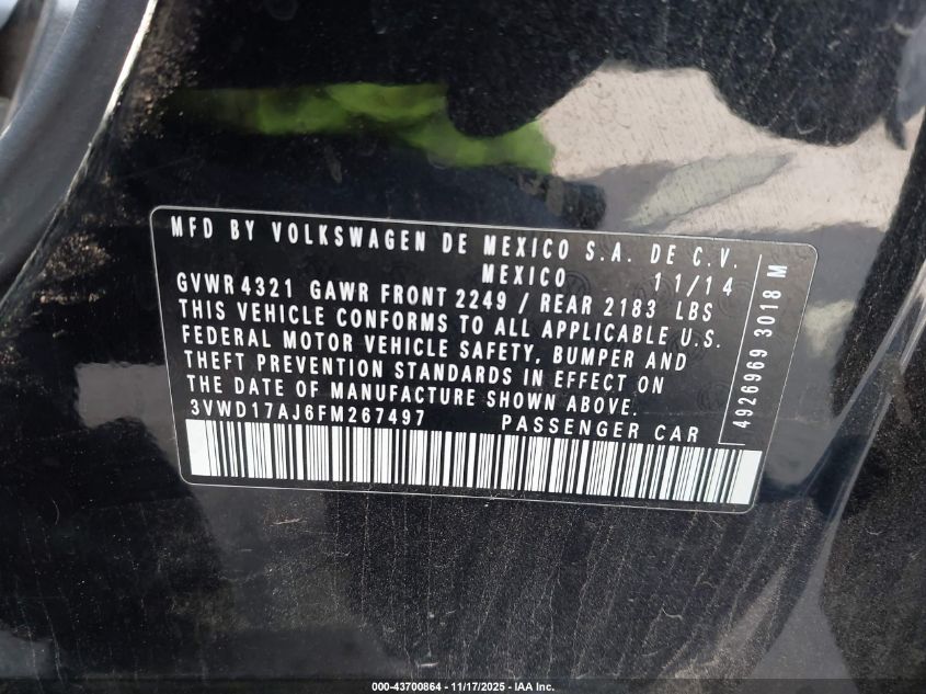 2015 VOLKSWAGEN JETTA 2015 року Бензин, 1.8, Передній привід, vin - 3VWD17AJ6FM267497 з США