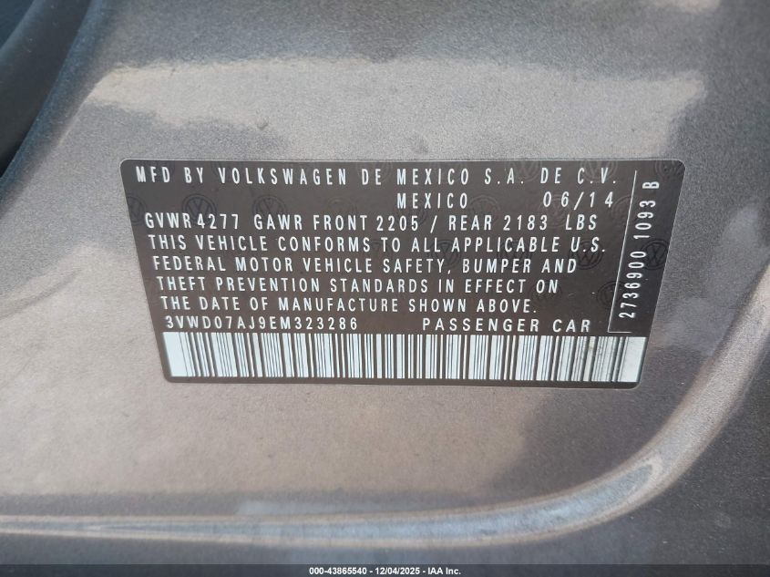 2014 VOLKSWAGEN JETTA 2014 року Бензин, 1.8, Передній привід, vin - 3VWD07AJ9EM323286 з США