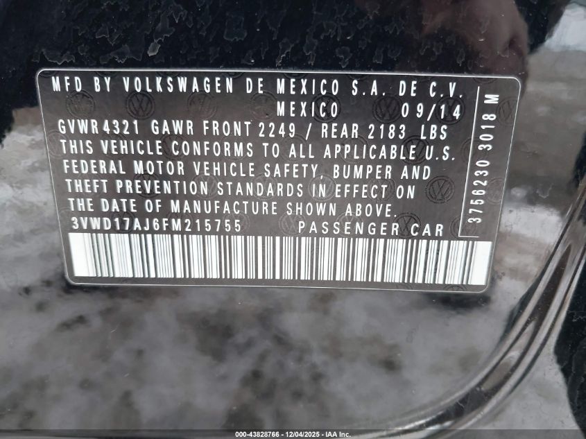 2015 VOLKSWAGEN JETTA 2015 року Бензин, 1.8, Передній привід, vin - 3VWD17AJ6FM215755 з США