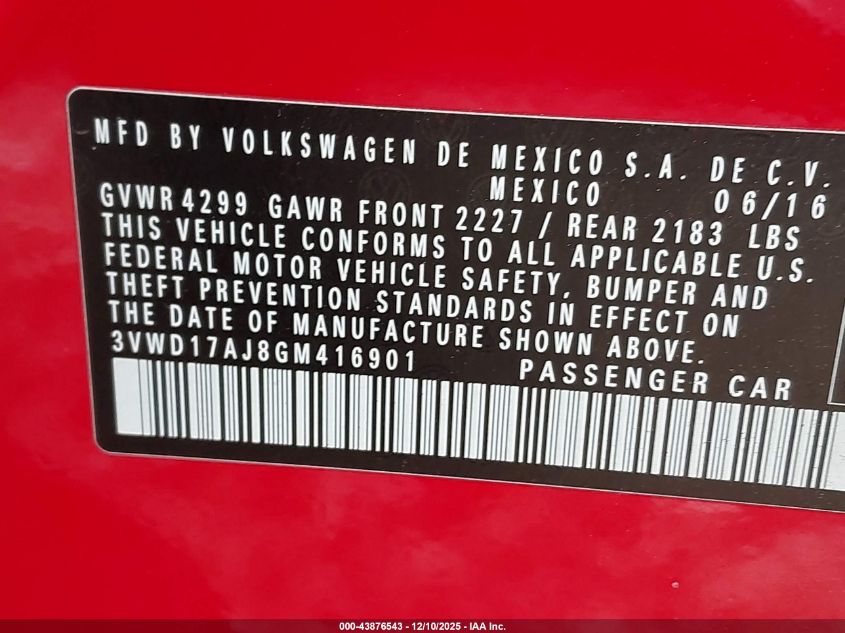 2016 VOLKSWAGEN JETTA 2016 року Бензин, 1.8, Передній привід, vin - 3VWD17AJ8GM416901 з США