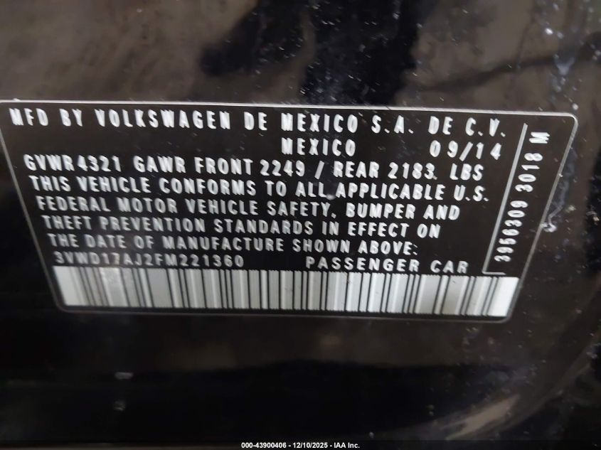 2015 VOLKSWAGEN JETTA 2015 року Бензин, 1.8, Передній привід, vin - 3VWD17AJ2FM221360 з США