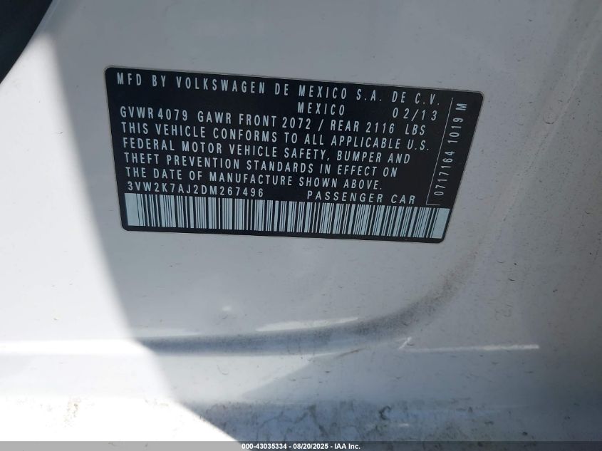2013 VOLKSWAGEN JETTA 2013 року Бензин, 2.0, Передній привід, vin - 3VW2K7AJ2DM267496 з США