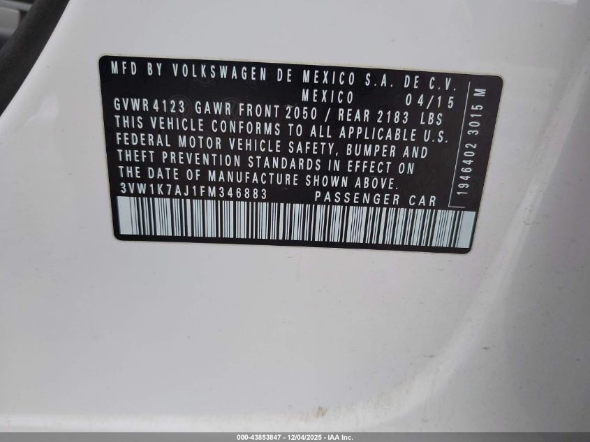 2015 VOLKSWAGEN JETTA 2015 року Бензин, 2.0, Передній привід, vin - 3VW1K7AJ1FM346883 з США