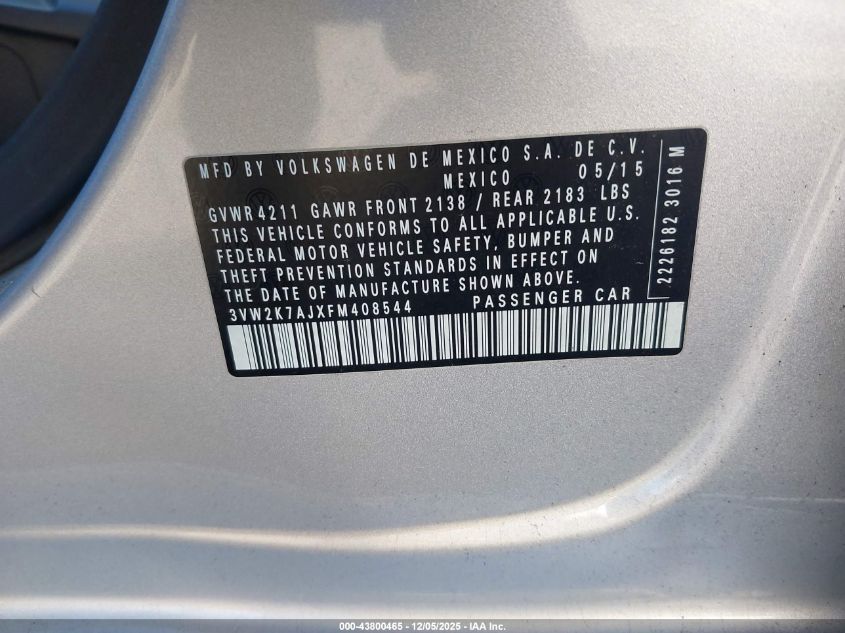 2015 VOLKSWAGEN JETTA 2015 року Бензин, 2.0, Передній привід, vin - 3VW2K7AJXFM408544 з США