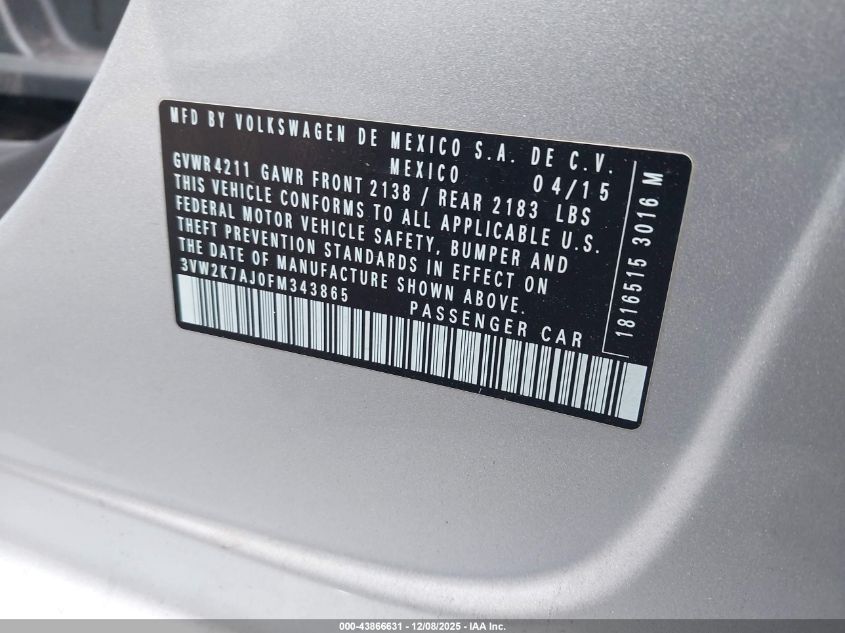 2015 VOLKSWAGEN JETTA 2015 року Бензин, 2.0, Передній привід, vin - 3VW2K7AJ0FM343865 з США