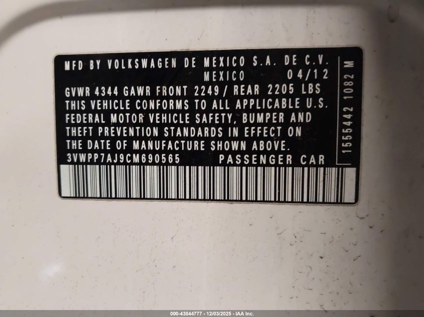 2012 VOLKSWAGEN JETTA 2012 року Бензин, 2.5, Передній привід, vin - 3VWPP7AJ9CM690565 з США