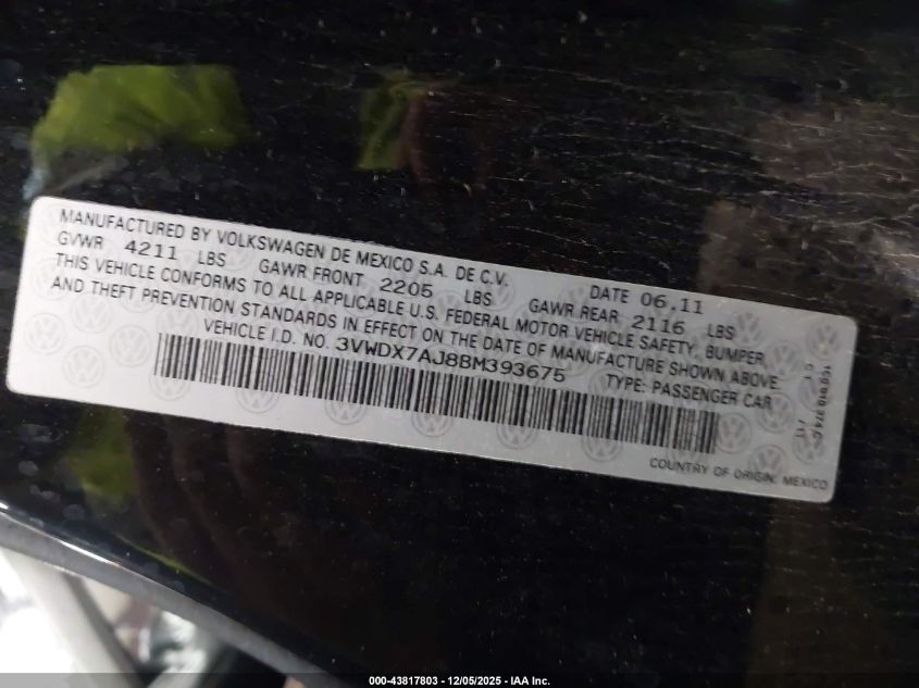 2011 VOLKSWAGEN JETTA 2011 року Бензин, 2.5, Передній привід, vin - 3VWDX7AJ8BM393675 з США