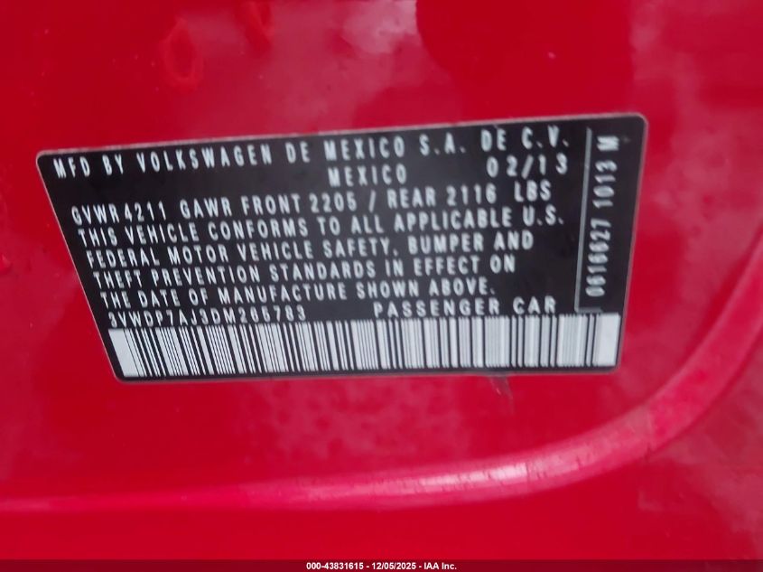 2013 VOLKSWAGEN JETTA 2013 року Бензин, 2.5, Передній привід, vin - 3VWDP7AJ3DM265783 з США