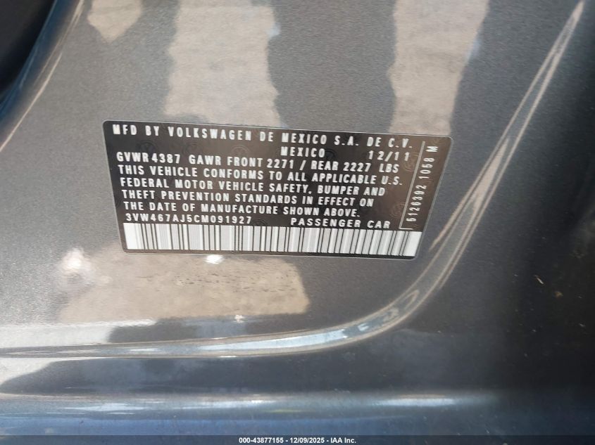 2012 VOLKSWAGEN JETTA 2012 року Бензин, 2.0, Передній привід, vin - 3VW467AJ5CM091927 з США