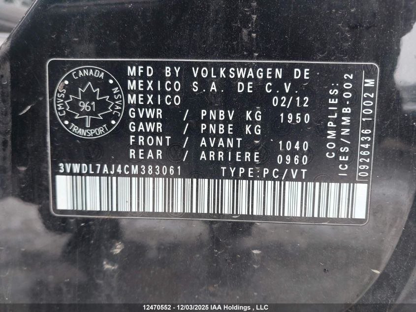 Колір ЧорнийЦиліндри 4Привід Передній привідVIN 3VWDL7AJ4CM383061Стан СтаціонарноУшкодження ПередняДата аукціону 2025-12-10 AutoRIA