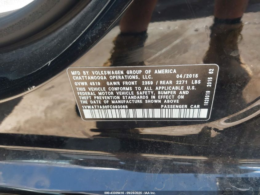 2015 VOLKSWAGEN PASSAT 2015 року Бензин, 1.8, Передній привід, vin - 1VWAT7A30FC093068 з США