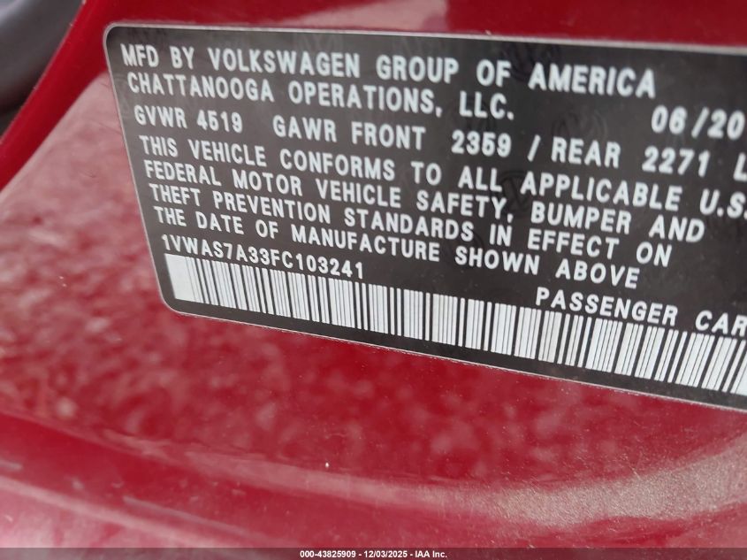 2015 VOLKSWAGEN PASSAT 2015 року Бензин, 1.8, Передній привід, vin - 1VWAS7A33FC103241 з США