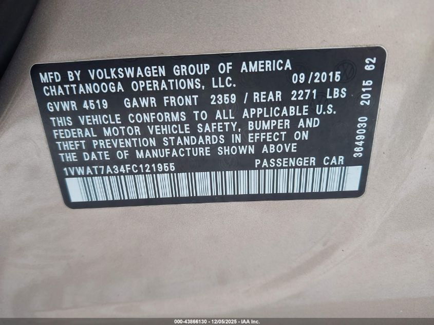 2015 VOLKSWAGEN PASSAT 2015 року Бензин, 1.8, Передній привід, vin - 1VWAT7A34FC121955 з США