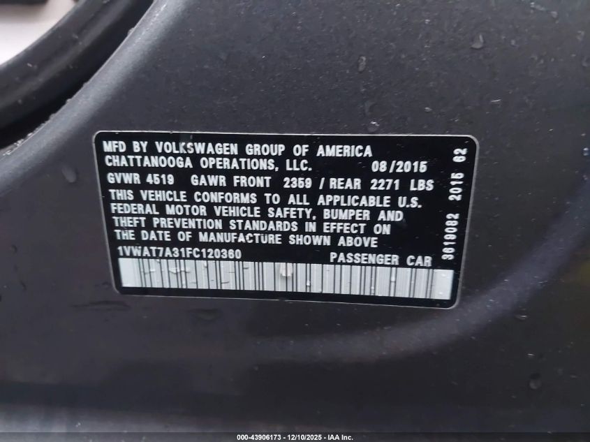 2015 VOLKSWAGEN PASSAT 2015 року Бензин, 1.8, Передній привід, vin - 1VWAT7A31FC120360 з США