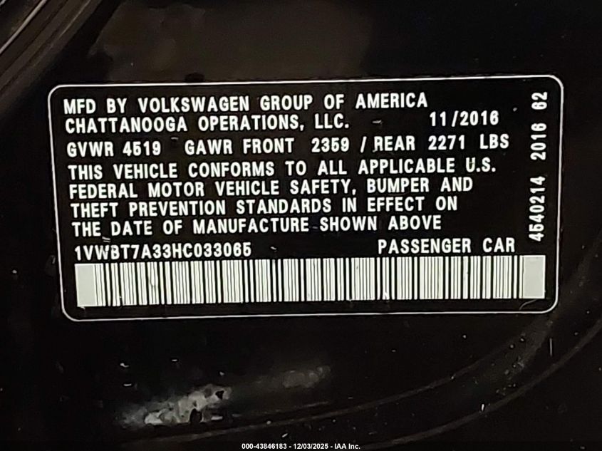 2017 VOLKSWAGEN PASSAT 2017 року Бензин, 1.8, Передній привід, vin - 1VWBT7A33HC033065 з США