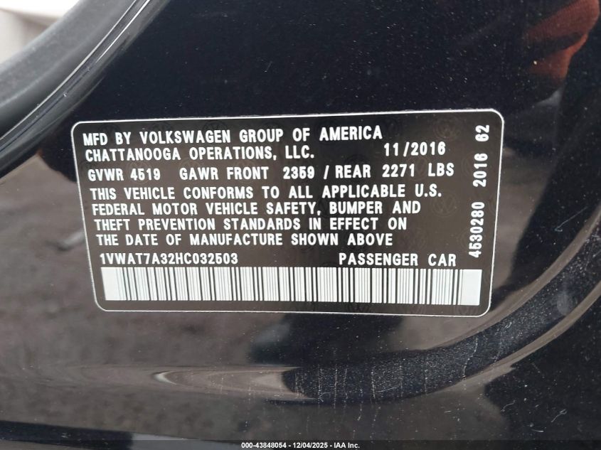 2017 VOLKSWAGEN PASSAT 2017 року Бензин, 1.8, Передній привід, vin - 1VWAT7A32HC032503 з США