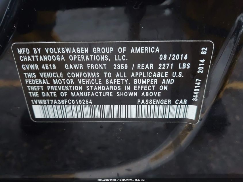 2015 VOLKSWAGEN PASSAT 2015 року Бензин, 1.8, Передній привід, vin - 1VWBT7A36FC019254 з США